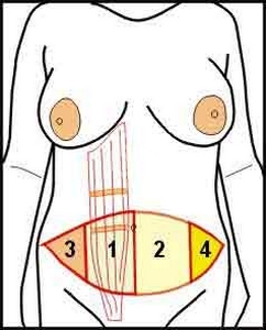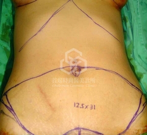 站長評估此情形後, 皮膚組織凹陷, 乳房中空缺損, 加上她非常在意腹部的鬆弛與肚臍整形變形, 以她如此薄的組織, 實在不適合放置人工義乳. 所以決定利用腹部的自體組織(autologous tissue), 也就是自己的東西, 填入乳房中, 同時"一兼二顧", 完成腹部+肚臍整形(abdominoplasty + umbilicoplasty).