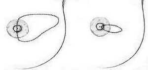 內視鏡隆乳之如前所敘述的胸大肌剝離完整, 其實也蘊含著胸大肌較不會像很緊的鍋蓋或是束縛罩住填充植入物, 然而更重要的是, 必須考量消費者隆乳前後體態, 因為任何正常胸部美麗又大的女生, 都會像水滴狀(tear drop)自然的下垂一點, 罩杯越大, 越是明顯(如附圖:巨乳).