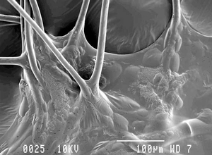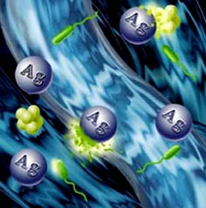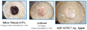 當Aquacel Ag 吸收滲液於纖維內,此時帶正電的銀離子(1ppm)會釋放出來與帶負電的細菌交互作用後而破壞細菌的細胞膜和細胞核,而達到殺菌的效果.
