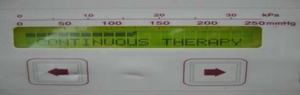 此時LED上壓力指示箭頭會跳動,不會穩定於設定的壓力值,螢幕下方原來顯示CONTINOUS THERAPY的字樣將變成CHECK TUBING AND DRESSING FOR LEAKING,此時檢查管子及敷料處是否漏氣(會有嘶嘶聲),管子部份需浮貼,否則一定會漏氣,如下圖: