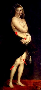 什麼是皺折與橘皮組織? 左圖這幅稱做" Helene Fourment, second wife of the artist, in a fur coat (The Furlet) ", 乃畫家 Peter Paul Rubens 於1638年所畫. 其中的人物中可見, 站長用紅色箭頭標出清晰的皮膚凹陷與皺折.
