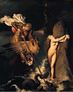 畫家是 Jean Auguste Dominique Ingres, 作品名稱叫做: ANGELICA SAVED BY RUGGIERO (1839), 目前珍藏於英國國家藝廊