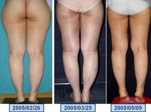 小腿神經整形與全腿雕塑照片集: 本站照片的縮放比例完全相同, 消費者可以比較相關細節的寬度即可以知道, 如膝蓋, 腳踝的寬度. 不會有某些網站任意編輯的奇怪比例照片, 因此可以避免誤導消費者. 尤其大小腿抽脂和蘿蔔腿治療的效果與尺寸有關, 因此對照片的精確要求度很高.