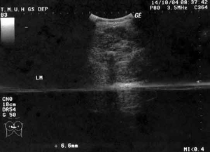 超音波: 追蹤小腿抽脂後的情況--- 上圖消費者皮下脂肪術後剩下6.6毫米(mm).