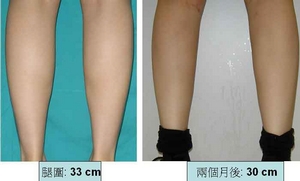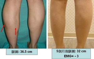 此位患者於別的診所接受傳統簡單不完全的內側腓腸肌神經切除術, 也是坊間診所所做的, 手術結果只從34.8 cm 到 33.8 cm, 效果不明顯之外, 更使得剩下的扁平比目魚肌更明顯, 稱做 Flat 或 Bowed Calf 效應(如上圖中). 小腿神經整形絕對不是有切就好!! 後來經過站長最新的內側腓腸肌加上部份比目魚肌神經切斷術, 小腿圍更瘦至32.5 cm, 橫張扁平的怪樣消失, 同時不影響活動力(如上圖右). 這項學術成果已發表於國際知名醫學期刊!!