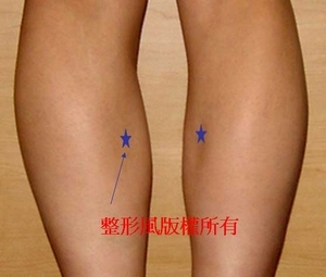這是另一個醫學中心的肌肉全直接切除術案例: 藍色星星標示出明顯突兀的凹陷處!! 關鍵處就在於肌肉切除術是刻意的切一塊下來, 不是順順自然的萎縮, 所以會有與週遭不搭嘎的奇怪腿型產生. 您看過冰淇淋挖一勺起來的樣子吧!! ㄎ一ˋ 一角(台語).