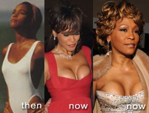 歌壇天后惠妮休斯頓, 則是假奶的受害者. 妳看兩坨內側明顯的人工隆起痕跡, 絕對是不夠完美自然的隆乳典範.