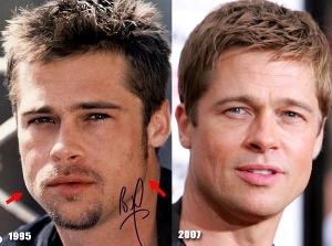 布萊德彼特的帥, 看來還是有時間差的, 過去下頷骨角過寬, 咀嚼肌過大的現象, 後來經過"處理", 臉型就更佳了