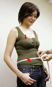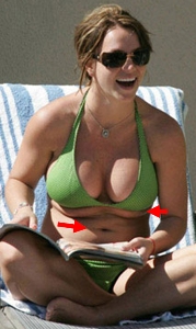 關大美女其實保養得很好, 只是熟女常見的問題, 地心引力與缺少運動, 都會造成, 胸部下垂與小腹微凸. 也難怪關大美女被量腹圍的時候, 表情尷尬. 這還是關大美女沒生過小孩, 看下圖, 生過小孩的小甜甜布蘭妮, 加上另一個因素, 肥胖, 就會加劇惡化胸部與腹部的老化問題.
