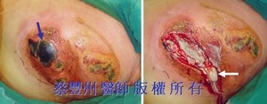 這是很嚴重的糖尿病傷口, 患者的部位在屁股上, 加上延誤就診, 在地區醫院看門診只吃消炎藥一個月之後, 變成上圖左的情況. 家屬發覺不對勁 趕快到蔡豐州醫師門診求助. 可以看到其實整個左邊屁股皮膚下方都是膿(pus)的感覺, 皮膚浮浮薄薄的, 藍色箭頭指得是 黑色痂皮(black eschar) : 這是經典的因為發炎破壞局部血液循環, 造成皮膚壞死的範例, 不是不可能, 眼見為憑.