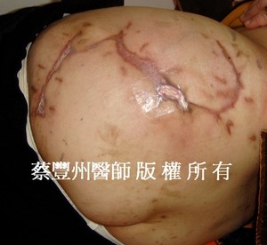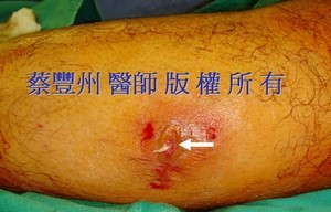 左圖是較輕微的例子, 一般都是很局部, 像這樣. 此案例位在小腿肚(calf), 患者因為一發現不對, 就到整形外科就診, 因此治療兩週就好了. 所以, 只要好好切開引流膿, 就很快可以痊癒. 總歸一句話, 病千萬不要拖, 傷口也一樣.