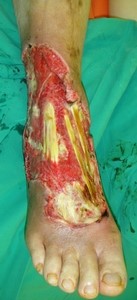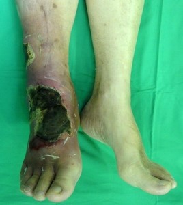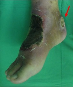 此患者被狗咬之後, 忽視傷口的嚴重性 結果延誤病情導致整個發炎, 皮膚因為下方膿(pus)太多, 使得黑色痂皮, 全層壞死(black eschar, full thickness necrosis)