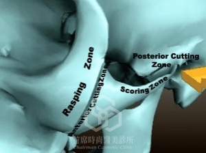 第一是顴骨本體(body)會造成往前突的視覺效果, 解決辦法就是要將它磨平一點, 減少體積, 再來鋸斷本體與顴骨弓的交界, 如此可以壓進去, 讓往前突的效果"雙效合一"地減輕.